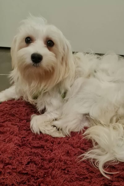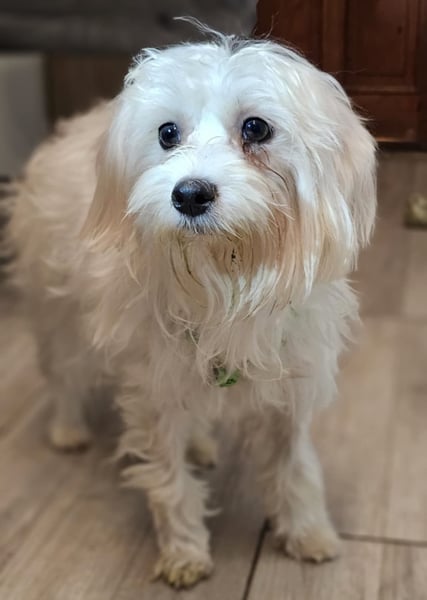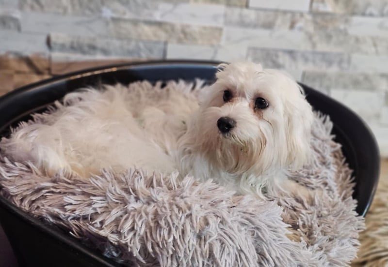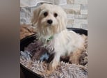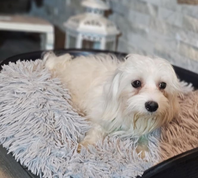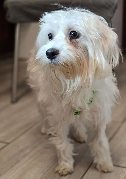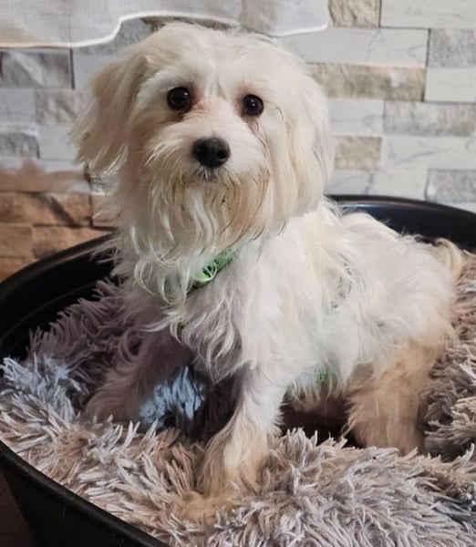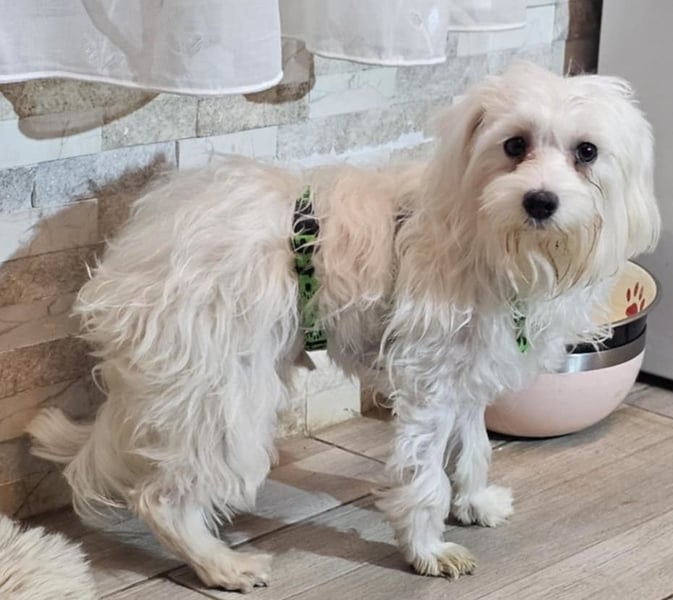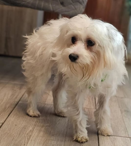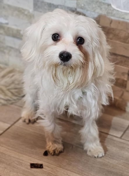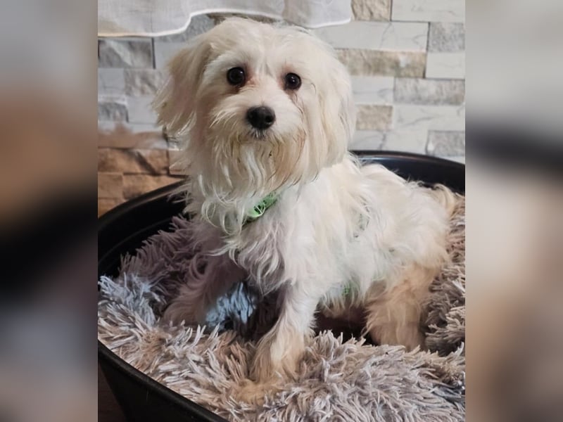 Lubert, Rüde, Malteser Mischling, geboren ca. 02. November 2024, kastriert, Schulterhöhe: ca. 30 cm und ca. z.Z. 4,5 Kilo, Vermittlung zu Katzen: ja, wenn diese das Leben mit Hunden kennen.