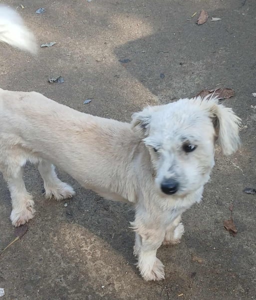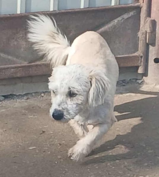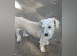 Marley, Mischlingsjunge (Malteser/Bichon Frisé Mix?), geboren am 02.02.2025, hat eine Schulterhöhe von ca. 30 cm und wiegt etwa 7 kg.