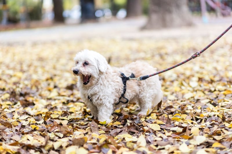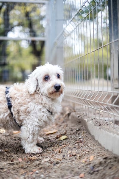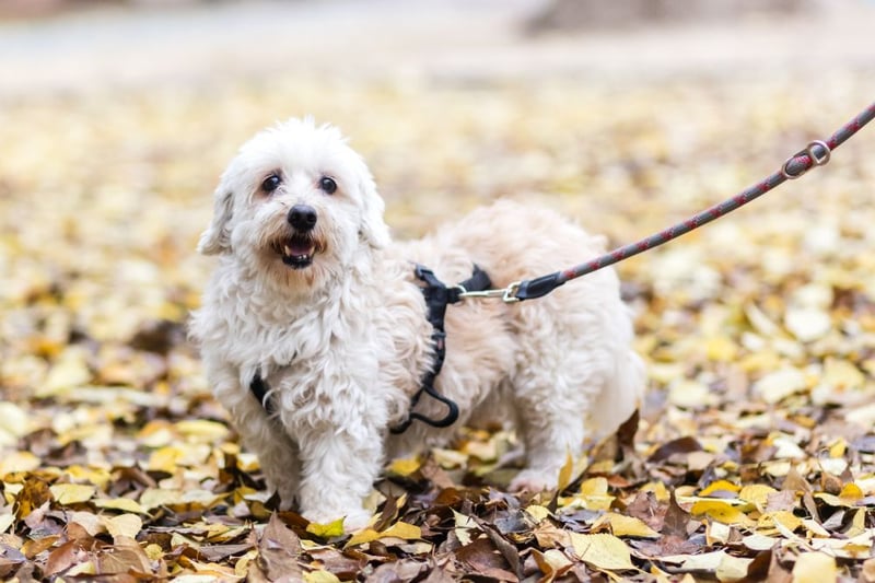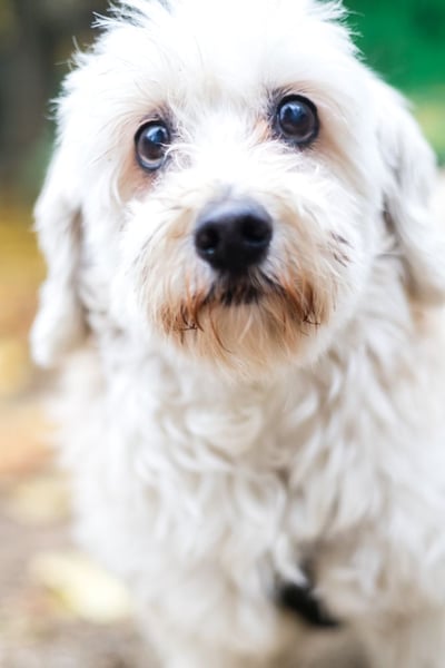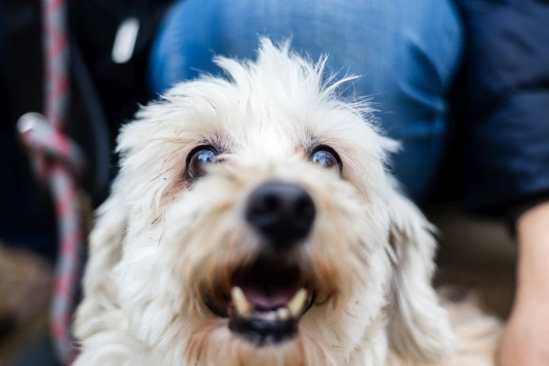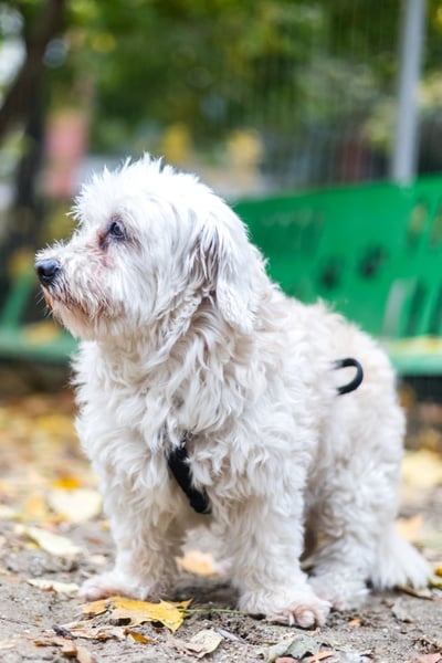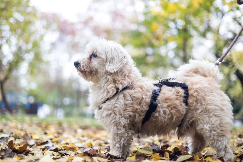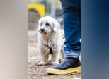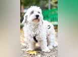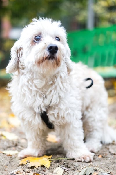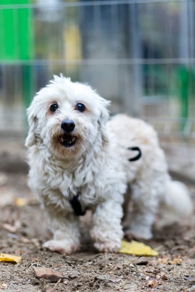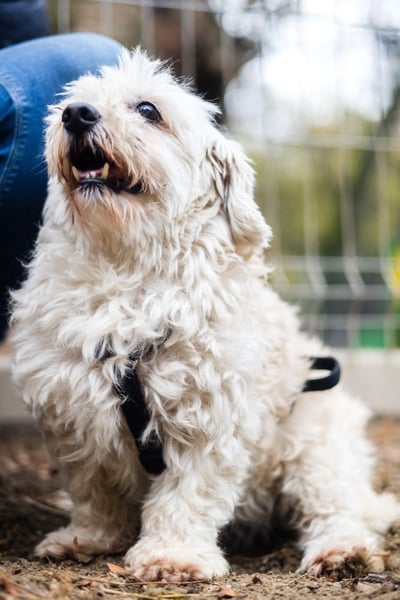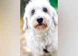 Hatchi ist ein kleiner, älterer Hund mit flauschigem, cremefarbenem Lockenfell, das ihm ein besonders weiches und zartes Aussehen verleiht.
