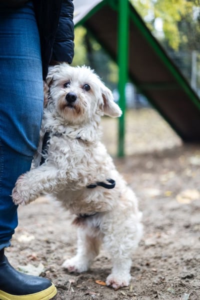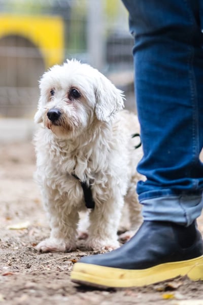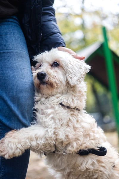Lange Spaziergänge macht er nur gelegentlich – allerdings nur, wenn die Umgebung ruhig und gut beleuchtet ist. In Parks, auf unebenem Boden oder wenn Sträucher rascheln, fühlt er sich schnell unsicher und möchte lieber zurück nach Hause. Vermutlich wurde er in der Vergangenheit öfter von größeren Hunden bedrängt, denn bei Hundebegegnungen sucht er Schutz beim Menschen oder bittet manchmal sogar förmlich darum, hochgenommen zu werden.