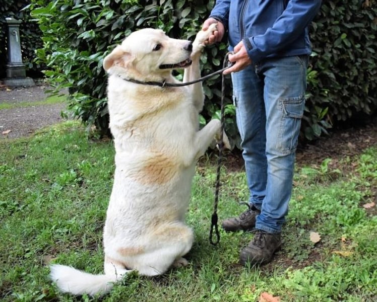 Den Menschen gegenüber jedoch ist er anders: Er sucht Kontakt, ist offen und freut sich über Zuwendung. Wenn jemand ruhig und verlässlich die Hand reicht, legt er sein Vertrauen darauf — selbst dann, wenn die Situation ihm Sorge bereitet. Dieses Vertrauen ist wie ein feiner Faden, der durch die Zähne gezogen werden muss, damit die Mechanik wieder funktioniert. An der Leine zeigt er schon gute Ansätze; die Führung gelingt, doch an manchen Stellen hakt es noch und braucht Feinarbeit und Ruhe.
