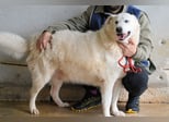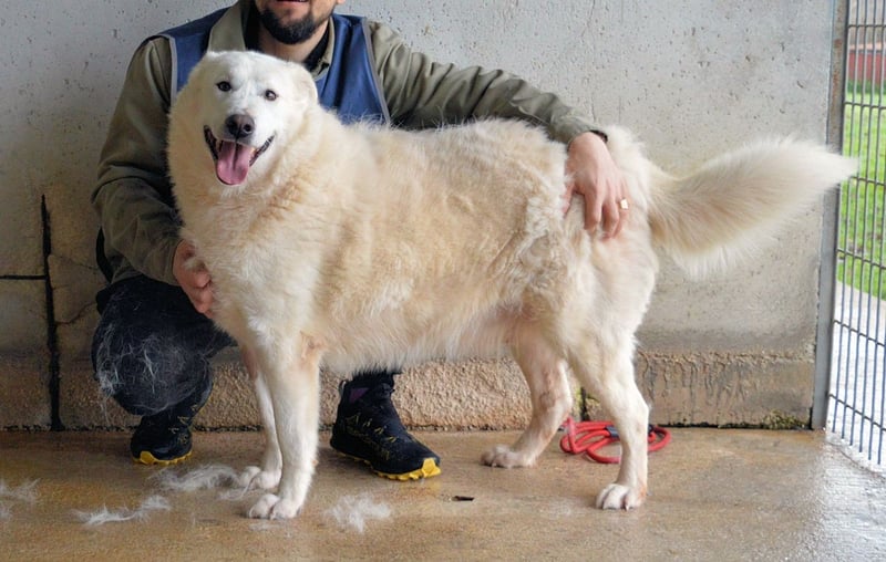 Er ist ein Hund wie ein Traum: bildschön, reinweiß, stattlich groß, mit dem man etwas an der Hand hat. Hauptberuflich Maremmano-Mischling. Deren Vorzüge sind eine robuste Gesundheit bei guter Haltung. Auch fit wie ein Turnschuh und aufmerksam, wenn es um das Wohl der Herde geht, die unter seiner Kontrolle lebt. Die Arbeitslinie dieser Hunde sind selbständige Herdenschutzhunde, die alt werden und keine Züchtungsschäden kennen. In welche Richtung er tendiert, können wir nicht sagen. Aber wir wissen, dass er sehr fein an der Leine geht und mit Menschen gesellig, verträglich und freundlich ist.
