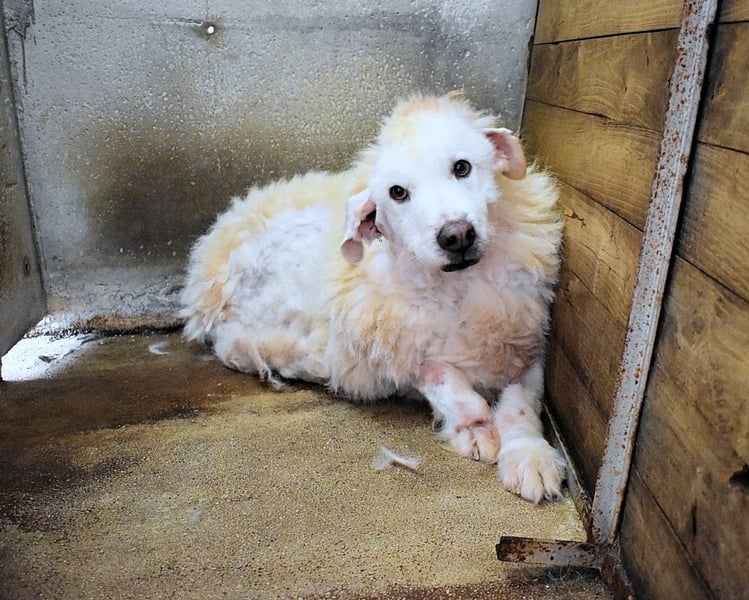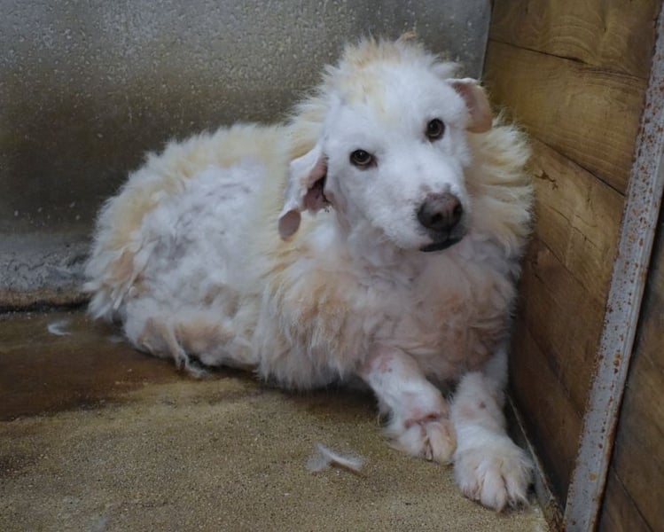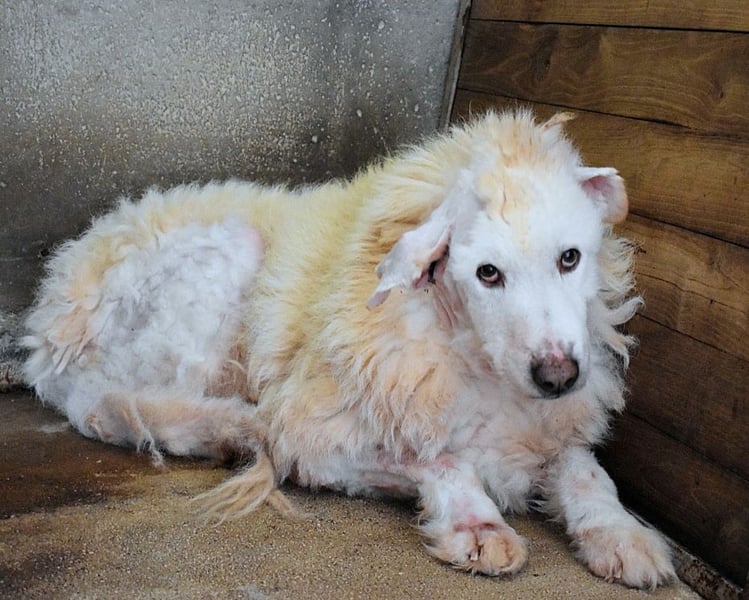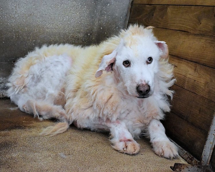 Liebe Besucherinnen und Besucher dieser Seite, können Sie Haigen auf den neuen Fotos noch wiedererkennen? Nein? Wir auch nicht! „Haigen ist zum Anbeißen, wawuschelig und einfach eine zutrauliche, zärtliche Augenweide!“, so durften wir ihn 2022 treffend beschreiben. Heute wirkt das Portrait von 2022 wie ein Bild, dem die Zeit die Konturen wegrieb. Was 2026 vor Ihnen liegt, ist die Hülle eines Hundes, es ist ein beschädigter Körper, in den Jahre der Gleichgültigkeit und Unterversorgung eingeritzt sind- nicht blutig, sondern in Krusten, Narben und Schmerzen- in der Art, wie der Rücken hängt und die Augen schwer geworden sind.