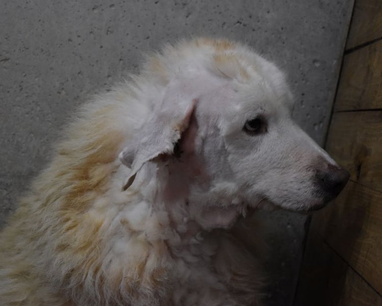 Sie sehen kein „Vorher“ mehr, nur ein „Jetzt“, das anklagt. Die Dreadlocks auf seinem Rücken hingen wie verkrustete Seile; man schnitt sie ab, weil sie wie Fesseln waren. Sein rechtes Ohr ist kein Ohr mehr, sondern ein zugeschütteter Schacht: der Gehörgang zugeschwemmt, so dicht, dass keine Behandlung vordringen konnte. Man sedierte ihn, um überhaupt reinigen zu können. Dermatitis hat sich wie Öl ausgebreitet — Rücken, Lefze, Pfoten, Hals: Flächen, die brennen, schuppen und aussehen, als hätte die Zeit an ihnen genagt. Leishmaniose: negativ — ein kleiner Funken in einem von Staub bedeckten Raum.