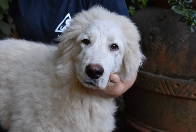 Leofric wird aber mit Sicherheit kein kleiner Löwe bleiben, mit 6 Monaten hat er schon eine Schulterhöhe von 52 cm. Ein zusätzlicher Blick auf die großen Pfoten und der Fall ist klar: Aus Leofric wird mal ein ziemlich stattlicher Hund werden. So, wie Maremmanen und ihre Mischlinge in der Regel eben aussehen. Leofric ist zusammen mit seinem Bruder Lambertino am 1. Juli 2025 in ein Hundelager gekommen - ob von einer Privatperson gebracht oder von Hundefängern in der Pampa eingefangen, wissen wir nicht. Aber, und auch das könnte klarer nicht sein, in einem Zwinger in einem großen Hundegefängnis sind die beiden Geschwister am komplett falschen Ort.