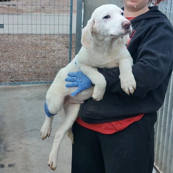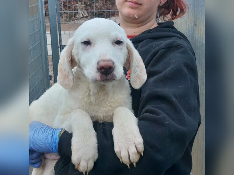Bibo ist einfach nur Zucker, wir denken, dass er ein Retriever-Maremmanomischling ist und ca. 55-60 cm groß wird.