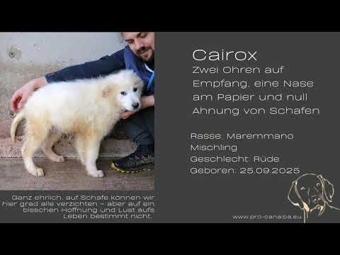 Geneigte Leserinnen und Leser, Cairox, Clyro, Calira und Cilwen sind vier Maremmano-Mischlinge, die ohne Mutter in einem italienischen Hundelager aufwachsen. Sie stehen ganz am Anfang ihres Lebens und brauchen Menschen, die bereit sind, ihnen Sicherheit, Struktur und Verständnis zu schenken. Diese Hunde werden einmal groß, selbstständig und eigenständig denken. Sie benötigen ein passendes Umfeld und Menschen, die ihre besonderen Eigenschaften schätzen und lieben. Wenn Sie einem dieser Hundekinder ein Zuhause schenken möchten und sich noch nicht mit Herdenschutzhunden auskennen, bitten wir Sie, sich vorab über diese besonderen Tiere zu informieren: https://www.pro-canalba.eu/auslandstierschutz/herdenschutzhunde/ . Und vielleicht beginnt dann genau hier eine gemeinsame Geschichte für einen Hund und seinen Menschen … oder für einen Menschen und seinen Hund