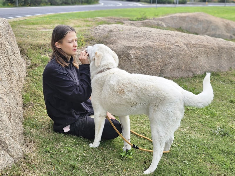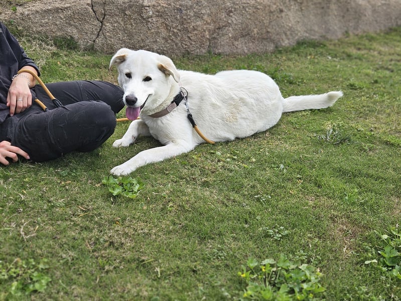 Snow geht sehr gut an der Leine, ist kein Leinenpöbler, versteht sich mit Artgenossen.
