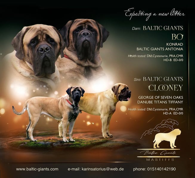Im Zwinger Baltic Giants ist ein wunderschöner Wurf gefallen. Die Eltern sind vollständig untersucht und haben ihre Zuchttaugleichkeit ohne Fehler bestanden. Aktuell sind die Welpen 10 Wochen alt. Die Welpen wachsen im Haus auf und werden mit allen möglichen Alltagsituationen bestens sozialisiert. Aktuell sind noch Fabiola und Finley auf der Suche nach einem liebevollem Zuhause. Keine Abgabe in reine Zwingerhaltung. Reine Preisanfragen werden nicht beantwortet. Bei Interesse gerne per mail oder 015140142190.