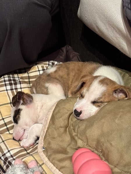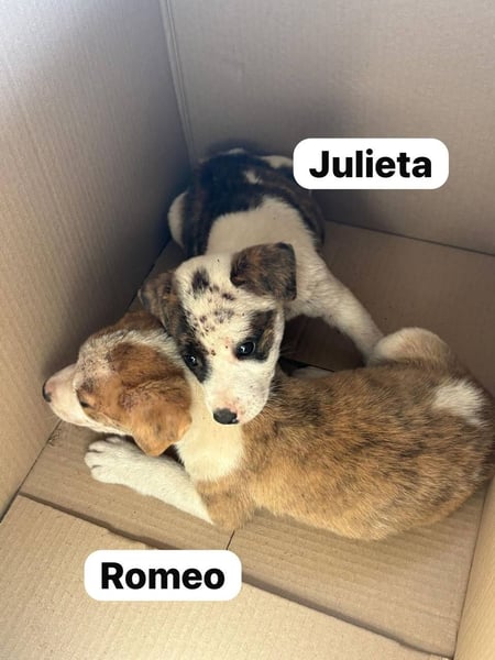 Seitdem geht es in ihrer Pflegefamilie jeden Tag ein bisschen lustiger zu. Die kleinen Forscher, die zum Glück noch nicht allzu schnell unterwegs sind, finden alles interessant, was sich in einer Wohnung finden lässt. Schuhe, Socken, Schubladen, Stuhlbeine, und natürlich die Füße ihrer derzeitigen Lieblingsmenschen. Aber wie sollte man so einem kleinen Wesen nicht verzeihen können? Die Wachphasen werden bald länger sein, der Appetit der noch so handlichen Welteroberer deutlich wachsen, denn Julieta und Romeo haben Mastin-Gene. Natürlich lässt sich bei so jungen Hunden nicht genau sagen, wie groß sie mal werden, es ist ja auch nicht bekannt, was sich außer dem typisch spanischen Herdenschutzhunde noch in ihrer Ahnenreihe versteckt, aber eins ist klar: Klein und handlich bleibt dieses dynamische Duo nicht.