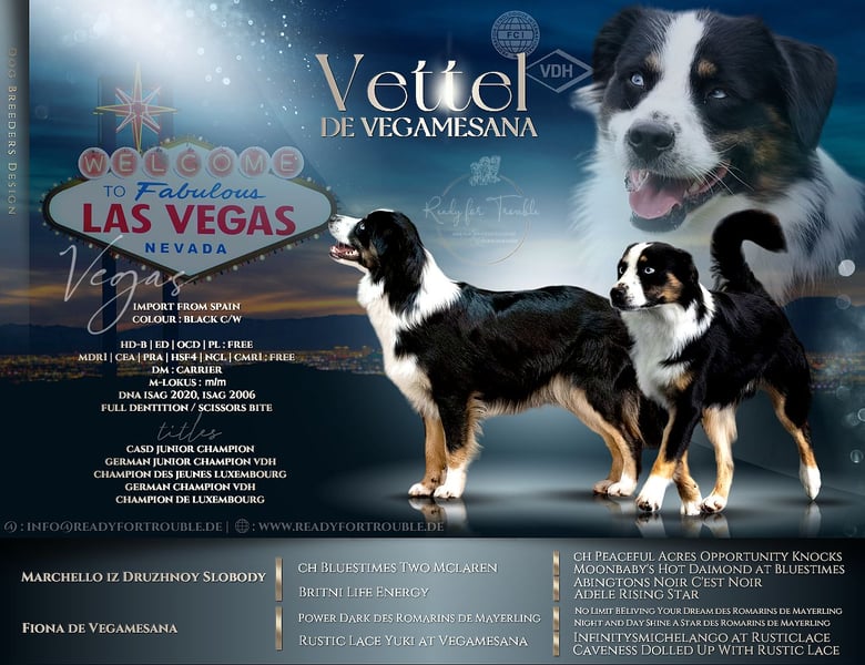 Vegas ist unser charismatischer Rüde. Mit seinem eindrucksvollen Erscheinungsbild und seinem freundlichen, offenen Wesen zieht er sofort die Aufmerksamkeit auf sich und gewinnt schnell jedes Herz. Er vereint die typischen Eigenschaften des Miniature American Shepherd: hohe Intelligenz, große Aufmerksamkeit, Freude an der Arbeit und eine bemerkenswerte Lernbereitschaft.