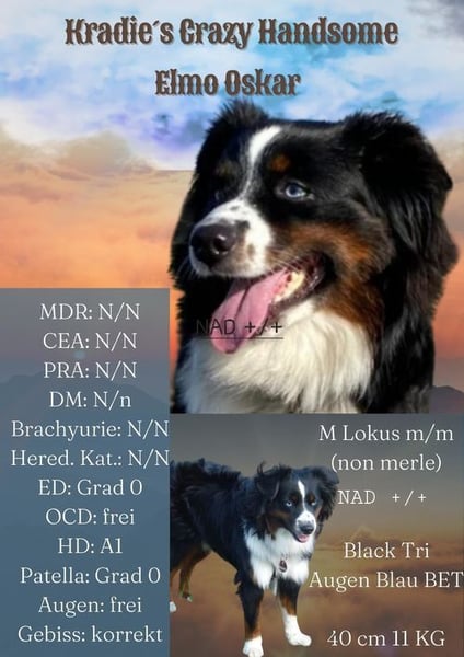 Kradie's Crazy Handsome Elmo Oscar steht gesunden und untersuchten Hündinnen zum decken zur Verfügung.