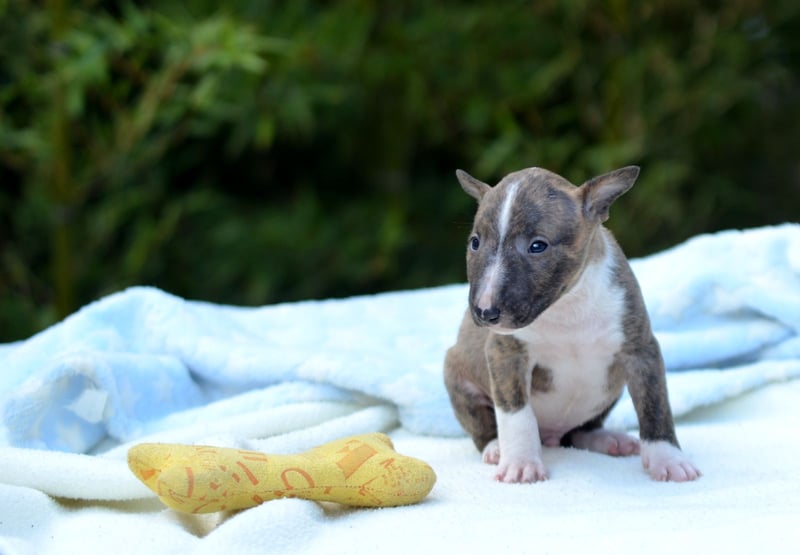 Das ist Gizmo, der charmante gestromte Mini Bull, der mit seinem wachsamen Blick und seinem fröhlichen Wesen alle Herzen im Sturm erobert.