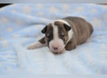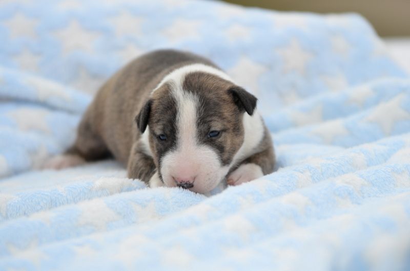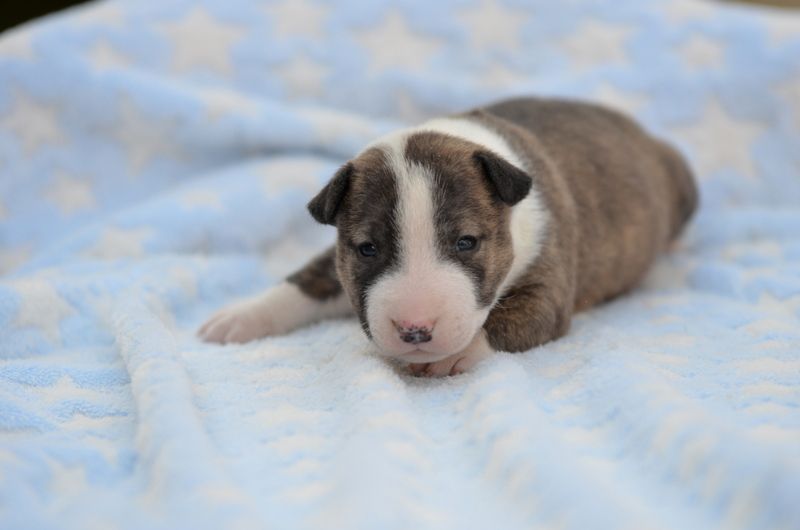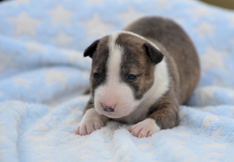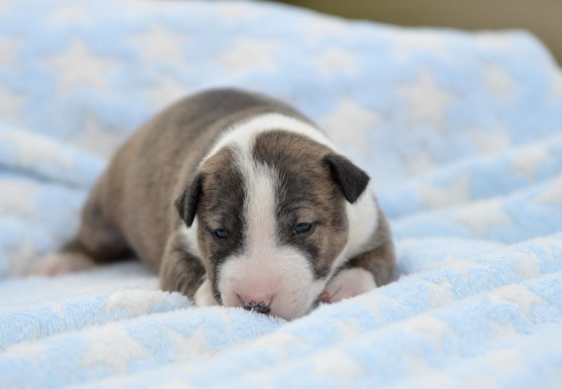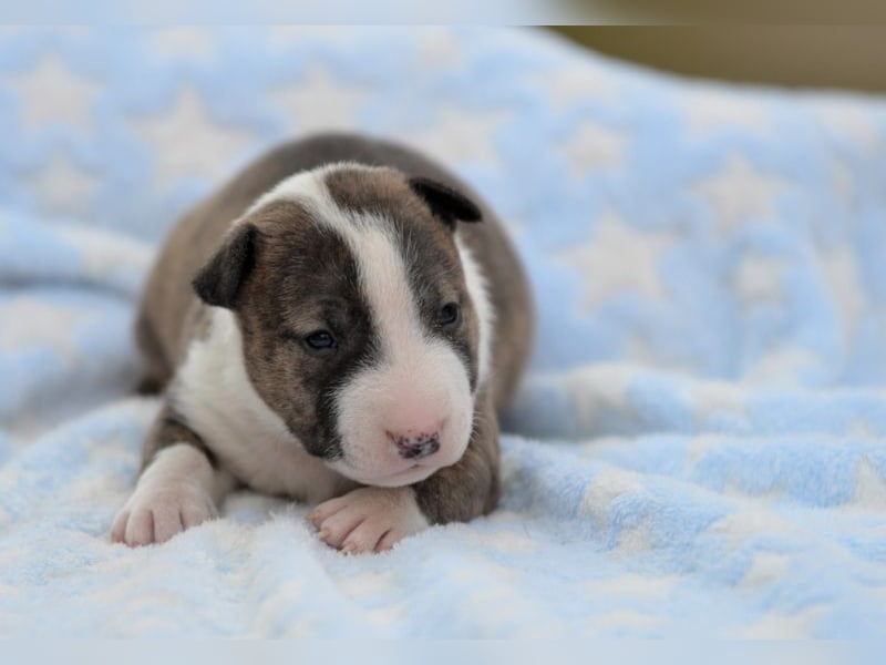 Zu verkaufen: Nolan, ein wunderschöner gestromter (brindle) Mini Bull Terrier Welpe. Mit seiner besonderen Zeichnung und seinem ausdrucksstarken Erscheinungsbild ist er ein echter Hingucker.