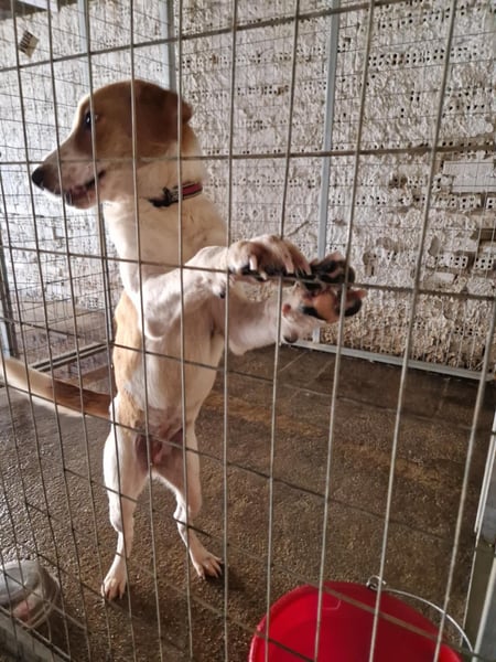 Da es keinen festen Platz für sie gibt, mussten Dalia und Arleta nun ins öffentliche Shelter ziehen. Seitdem leiden sie sehr unter dem Lärm, der Enge und dem Stress dort. Arleta weint laut, und Dalia springt verzweifelt ans Gitter, sobald jemand vorbeigeht – beide hoffen auf ein kleines Stück Aufmerksamkeit, auf Nähe, auf Hoffnung.