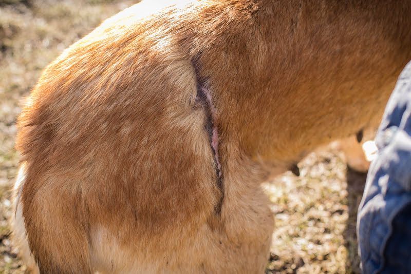 Als kleines, wohl damals recht schmerzhaftes Mitbringsel aus der Romasiedlung hat sie am rechten Oberschenkel eine Narbe, die bis zum Rücken reicht. Wir wissen nicht, was da geschehen ist, allerdings nach einer fachmännischen Behandlung sieht die Narbe nicht aus.