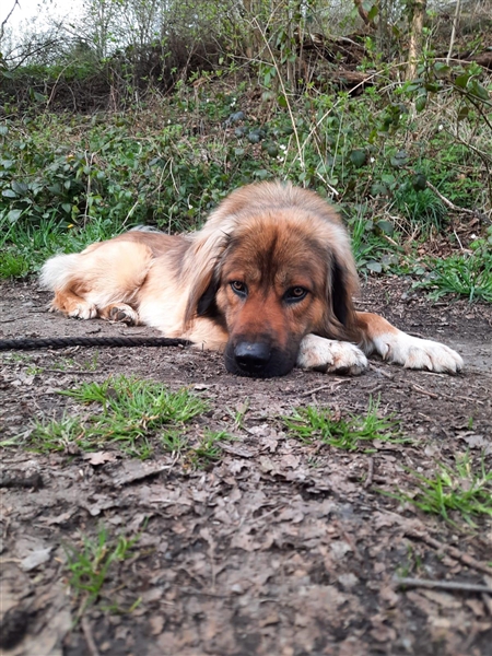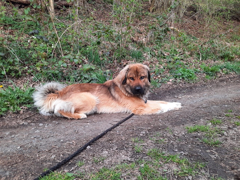 Er ist ca. 70cm groß und wiegt um die 32kg, vermutlich ist er ein Herdenschutzhund-Mix, er kommt ursprünglich aus Rumänien.