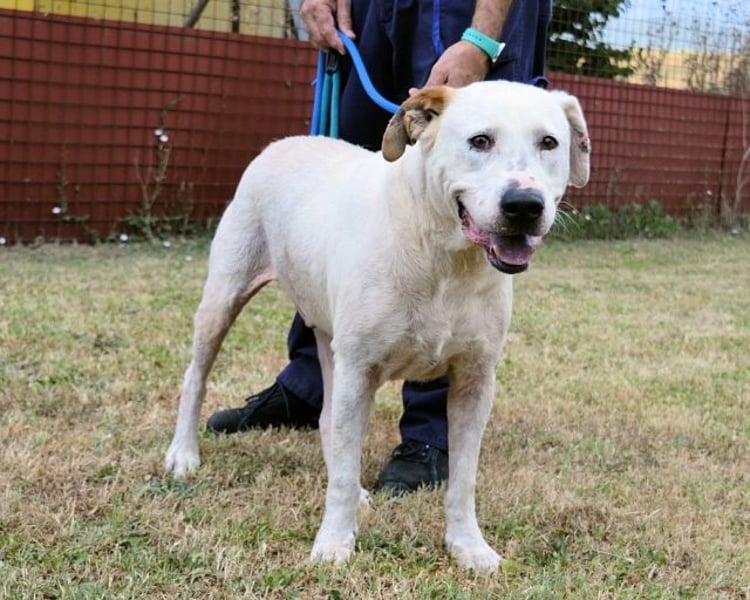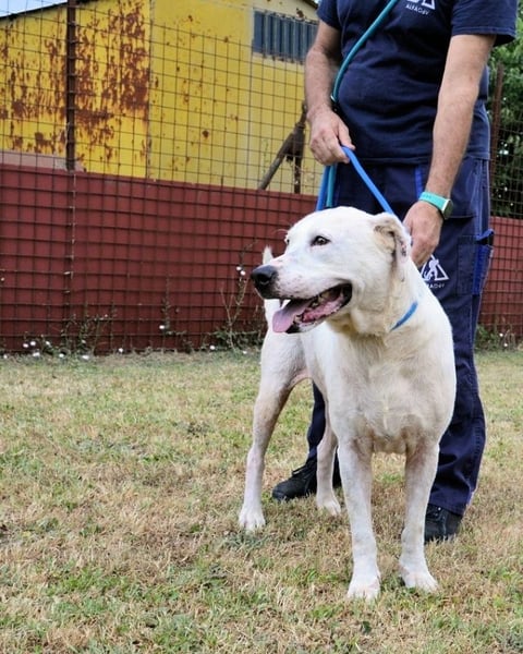 Und tatsächlich gibt es nun einen kleinen Hoffnungsschimmer für Plutarco, denn die Gitterstäbe haben sich für einen kurzen Moment geöffnet. Jetzt, da Sie liebe Tierfreunde diese Zeilen lesen, ist Plutarcos große Chance gekommen. Denn zum ersten Mal seit 5 Jahren wird er sichtbar gemacht. Plutarco ist da! Auch wenn er noch weit weg ist, auf kaltem Betonboden, hinter dicken Gitterstäben. Ihn gibt es und er wartet sehnsüchtig! Zusammen mit befreundeten Tierschützern durfte er seit einer Ewigkeit mal wieder Gras unter seinen Pfötchen spüren. Fast schon, als ob er sich darauf vorbereitet hätte, ging er vorbildlich an der Leine mit. Freundlich, aufgeschlossen und dem Menschen zugewandt, schnüffelte er sich durch die Wiese und konnte für kurze Augenblicke den Juckreiz vergessen, der ihn stressbedingt und aufgrund seiner derzeitigen Flohdermatitis jeden Tag begleitet. Doch wie es dem imposanten Plutarco geht, interessiert im Lager niemanden. So ist der Juckreiz das Einzige, was ihn tagtäglich begleitet. Und so sitzt der weiße Plutarco mit dem braunen Ohr alleine in seiner Zelle und wartet, dass sich die Gitterstäbe nochmals öffnen, um sich dann für immer hinter ihm zu schließen, weil er dann endlich nach Hause darf.