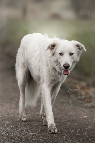 Ein großer, weißer Riese mit samtigem, selbstreinigendem Fell ist nicht das Einzige, was uns vermuten lässt, dass ein Maremmano in seiner Ahnenreihe steckt. Mit seinen 63 cm Schulterhöhe und 30 kg ist er ein imposanter Rüde. Er ist sehr wachsam und liegt gerne mit seinen Artgenossen auf der Terrasse, um seine Umgebung zu beobachten. Tenni ist sowohl mit Rüden als auch mit Hündinnen und Katzen verträglich. Fremden gegenüber ist er eher misstrauisch und braucht seine Zeit, um Vertrauen zu fassen. Lässt man ihm jedoch Zeit und Ruhe, gewinnt man sein Vertrauen und wird von seinem liebevollen Wesen überzeugt.