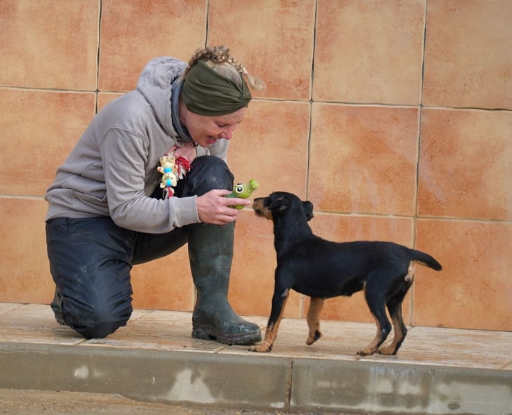 Ihre beiden Betreuerinnen Tere und Josefina berichten uns, dass Betty allen Menschen freundlich und aufgeschlossen begegnet. Sie lässt sich auch durch fremde Personen in der Tierheimsituation nicht beirren und zeigt auch bei Männern keine Berührungsängste. Betty lässt sich bereitwillig auf den Arm nehmen und schmust gerne. Genauso erkundet sie auch gerne neugierig den Auslauf und ist für jeden spannenden Input zu begeistern.