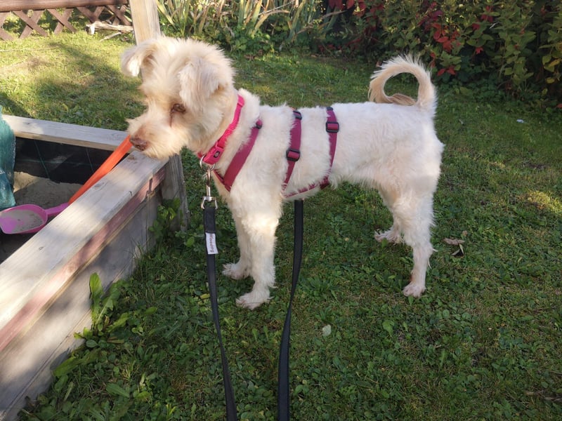 Im Haus ist Perla ruhig, bereits stubenrein und kann auch schon gut eine Zeit alleine bleiben. Draußen läuft sie schon sehr gut an der Leine und reagiert nur selten auf Umweltreize – eine tolle Begleiterin für Spaziergänge! Auch Autofahren meistert sie problemlos. Hunden begegnet Perla beim Spaziergang gelassen.