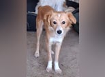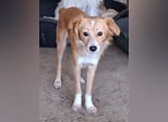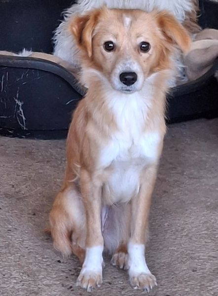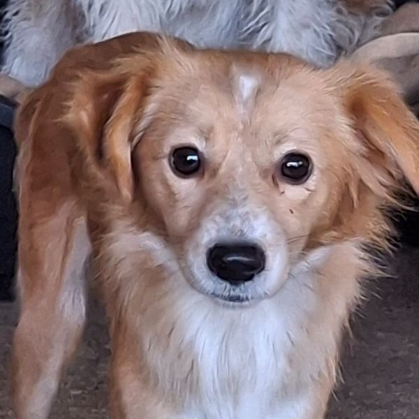 Alani ist eine eher kleine Hündin mit einem goldfarbenen Fellkleid und weißen Abzeichen. Sie hat leicht fransige Ohren und große Knopfaugen, die ihr ein sehr süßes Aussehen verleihen. Ein besonderes Merkmal ist ihre verkürzte Rute.