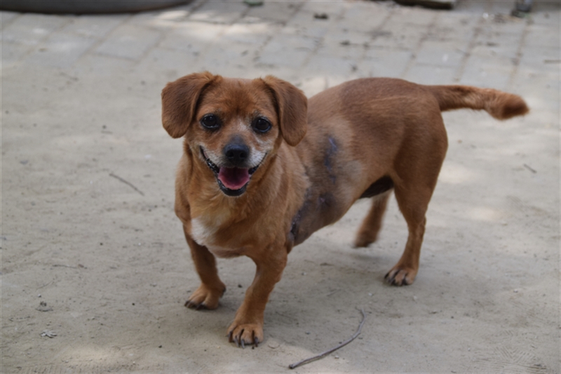 Penelope ist eine kleine, süße Hundedame. Im Mai 2024 wurde sie schwerst verletzt auf der Straße gefunden. Sie hatte schwere Bisswunden an Brust und Rücken. Wir vermuten, dass sie, auf der Suche nach was Fressbarem, in einen Garten geschlüpft ist, der von einem Vierbeiner bewacht und verteidigt wurde.