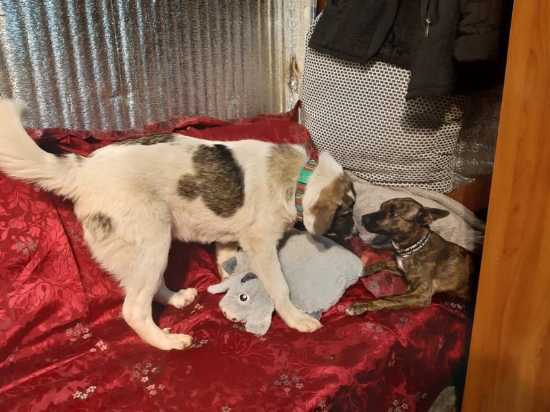 Außenbereich im Tierheim. Beide haben weiches Kuschelfell in der Grundfarbe weiß,