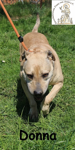 Donna ist eine ausgesprochen liebe Hündin, die Menschen mag, nicht zuletzt auch Kinder. Eine Eigenschaft, die Donna keiner zutraut, weil die ihr vererbten Listenhundgene sofort ins Auge fallen. Donna wurde aber nicht nur genetisch vom Schicksal benachteiligt. Unverantwortliche, rohe Menschen missbrauchten sie für Hundekämpfe. Insofern grenzt Donnas Sanftmut Menschen gegenüber an ein Wunder.