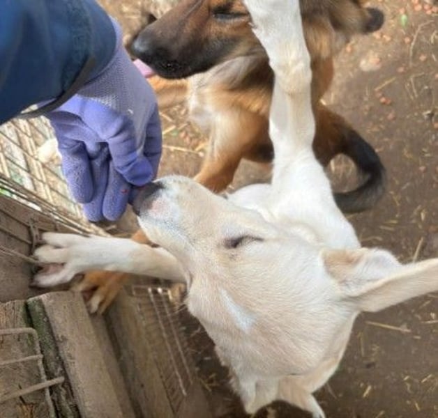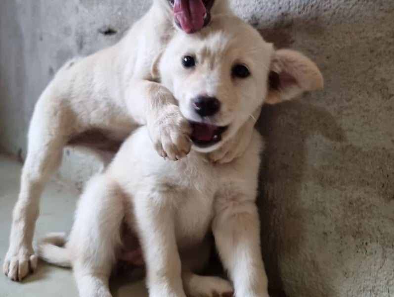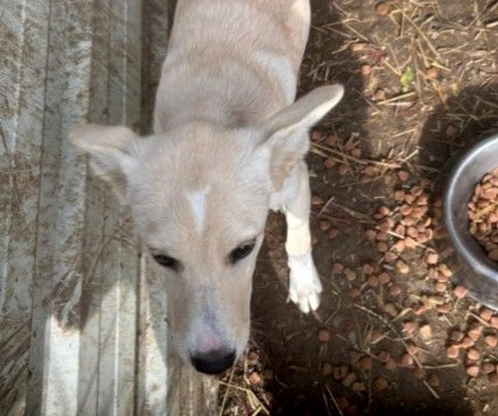 Leni wurde im Juni 2025 zusammen mit ihrer Schwester Luzie ganz allein auf einem Feld von einer Frau gefunden. Die Frau brachte die beiden Welpen anschließend ins Tierheim Free Amely.