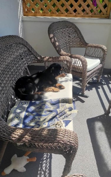 Rex hat ein mittleres Energieniveau. Im Haus ist er ruhig und schläft viel, genießt es aber auch draußen zu sein und eine Runde zu laufen. Er spielt gerne, aber er ist kein überdrehter Hund. Regelmäßige längere Wanderungen braucht er nicht – ein moderates Maß an Aktivität reicht ihm völlig aus, aber freut sich, auch wenn er zusammen mit seiner Pflegestelle auf kleinen Ausflügen geht.