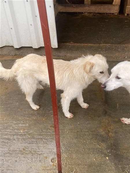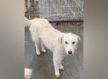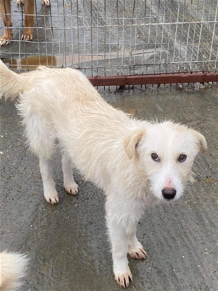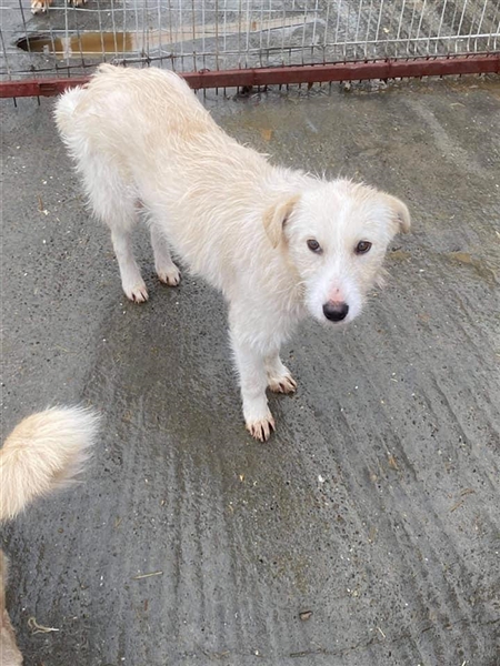 Die schneeweiße Flocke schaut etwas verunsichert aus ihren Knopfaugen. Dabei sein möchte sie trotzdem und zeigt Interesse an ihrer Umwelt. Beim Betreten des Zwingers wartet sie gespannt. Geht man auf sie zu und möchte sie streicheln, läuft sie aber noch ängstlich weg.