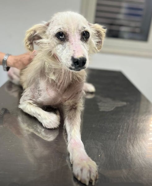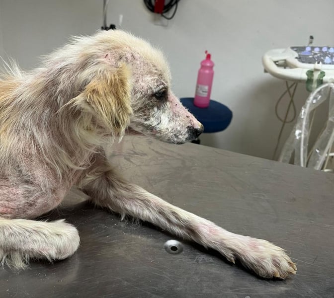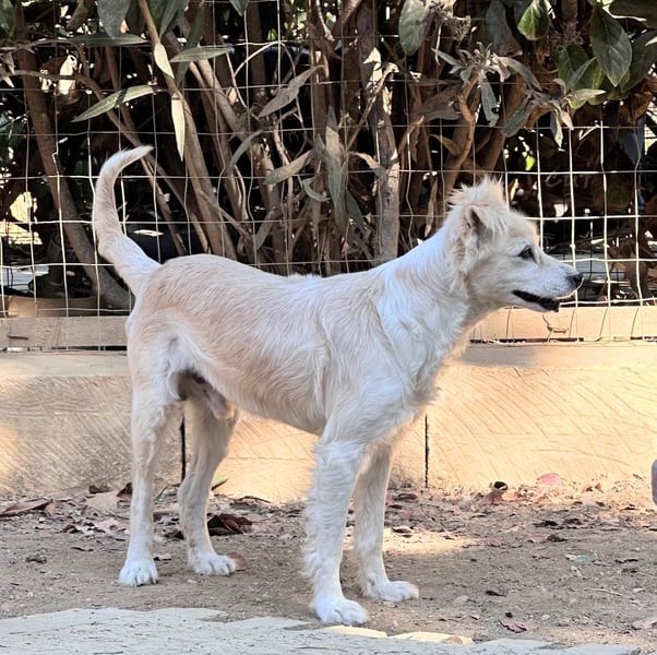 Auf COOKIE wurden wir im Juni 2025 aufmerksam. Der scheue, abgemagerte und augenscheinlich stark von Parasiten befallene Rüde, hielt sich schon seit Tagen in einem Wohngebiet auf. Einige engagierte Frauen stellten ihm täglich Futter hin und versuchten geduldig sein Vertrauen zu erlangen.