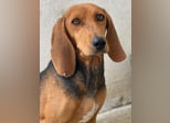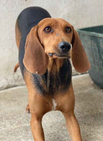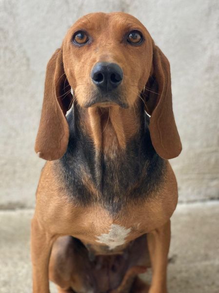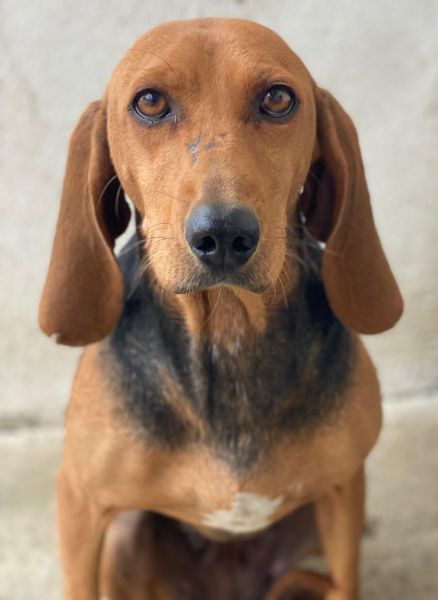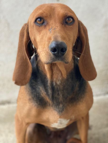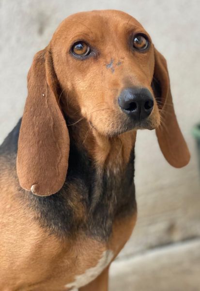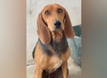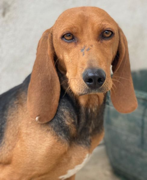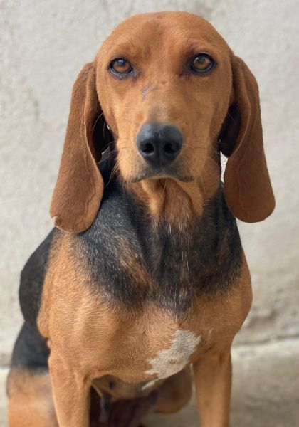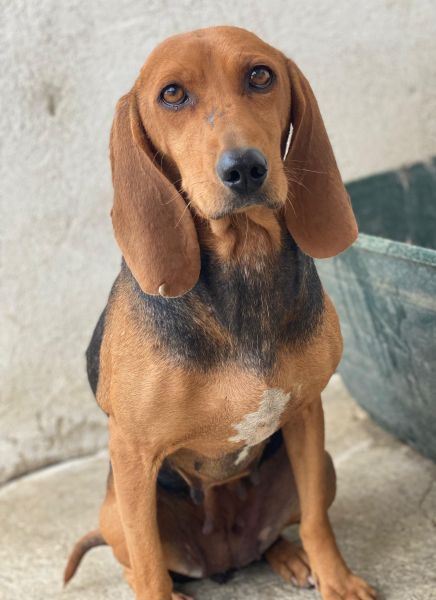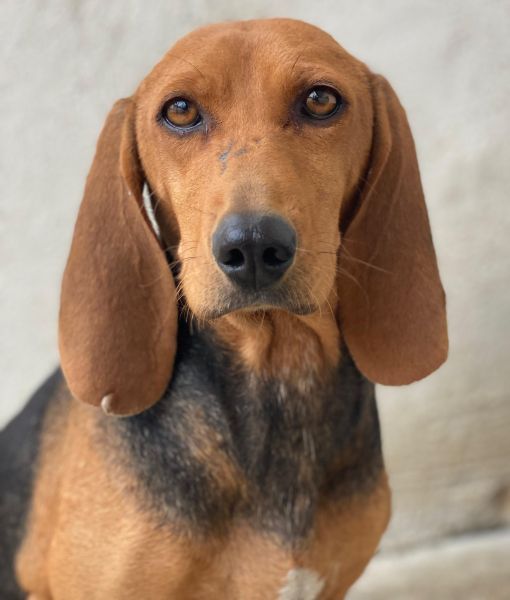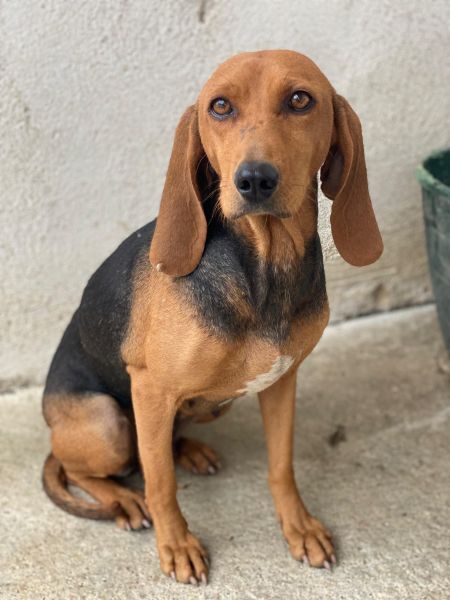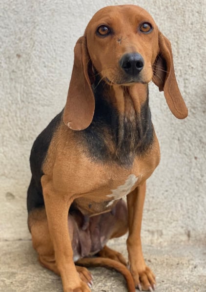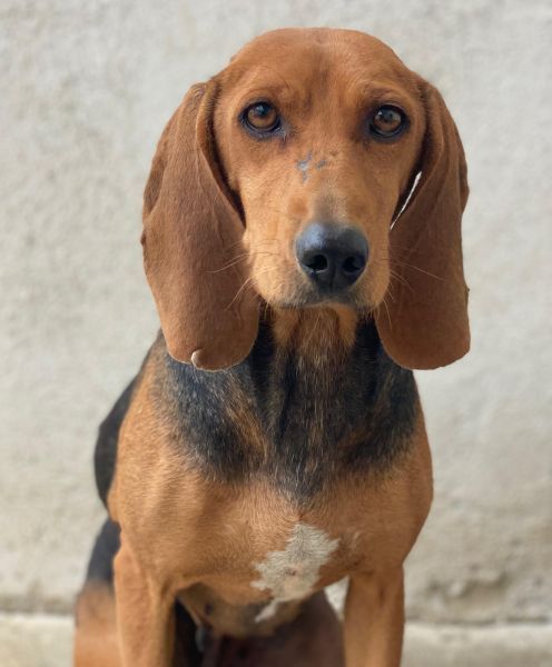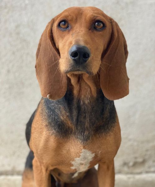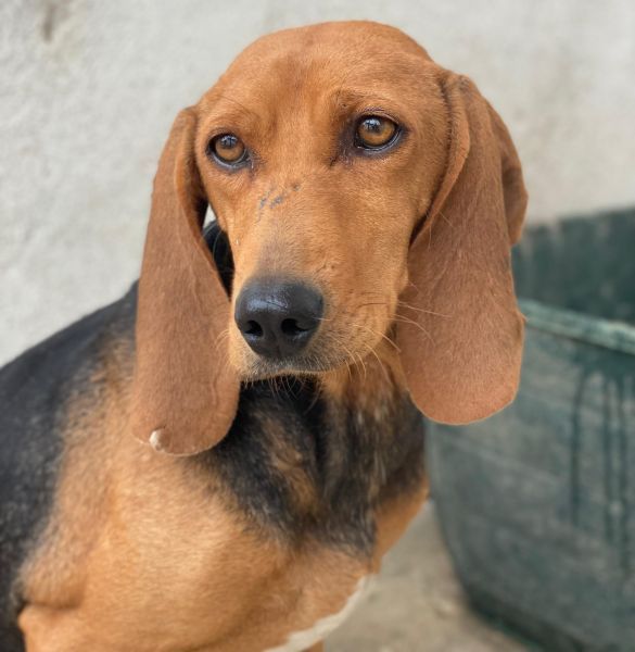 Tivra ist eine wunderschöne Hündin mit braun-schwarzem Fell, das von feinen weißen Zeichnungen geziert wird. Besonders auffällig sind ihre langen, weichen Schlappohren und ihre hübschen, hellbraunen Augen.