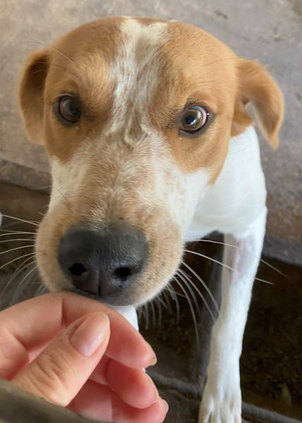 Der eher kleine Rüde ist überwiegend weiß, abgesehen von den warmen, kastanienbraunen Abzeichen, die seinen Kopf und seine Ohren zieren. Eins ist sicher: Benschi hat eine wunderschöne Seele. Er zeigt sich äußerst lieb und ist freundlich zu allen. Sanft sucht er den Kontakt zu Menschen und lässt sich unheimlich gerne kraulen. Er ist sehr neugierig und beginnt vorsichtig, seine Umgebung zu erkunden. Benschi ist noch kein Wirbelwind, sondern ein ruhiger, aufmerksamer Beobachter. Er braucht eine Familie, die ihm mit Geduld und sanfter Führung hilft, seine Unsicherheit abzulegen. Ein gutes Training, welches bei Bedarf auch professionell unterstützt werden kann, ist besonders wichtig für Benschi, damit er Schritt für Schritt lernen kann, was es heißt, ein Familienhund zu sein. Mit einer dicken Portion Liebe und positiver Verstärkung wird dieser Schatz bestimmt bald zeigen, wie viel Lebensfreude in ihm steckt.