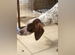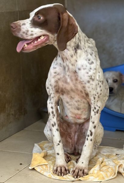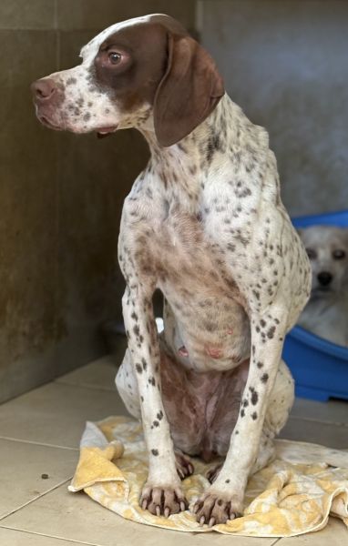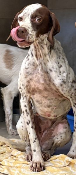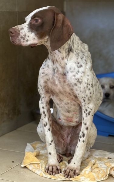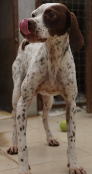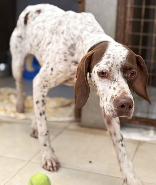 Acira ist eine ganz bezaubernde Hündin. Ihr helles, kurzes Fell ist mit markanten braunen Flecken an Kopf und Körper gezeichnet. Besonders auffällig sind ihre jagdhundtypischen Schlappohren und die braune Zeichnung um eines ihrer Augen. Ihre hellbraunen Augen blicken neugierig und zugleich vorsichtig in die Welt.