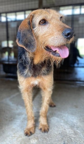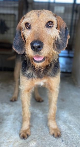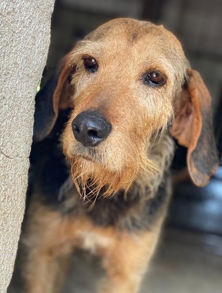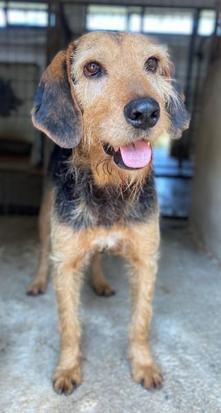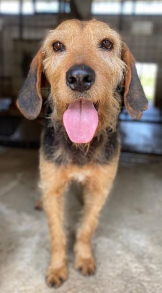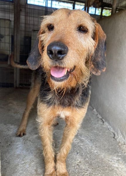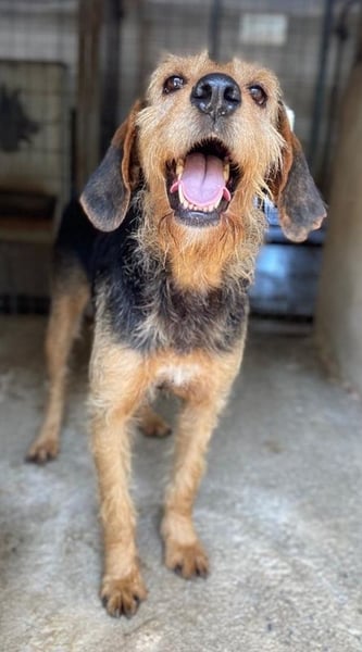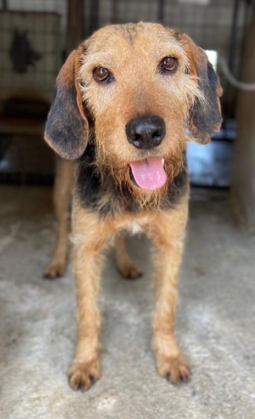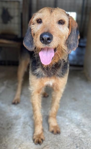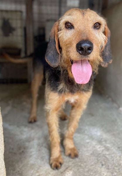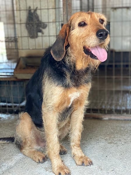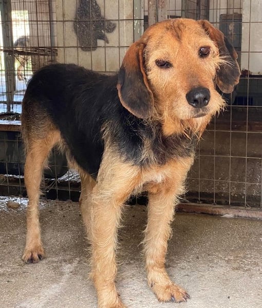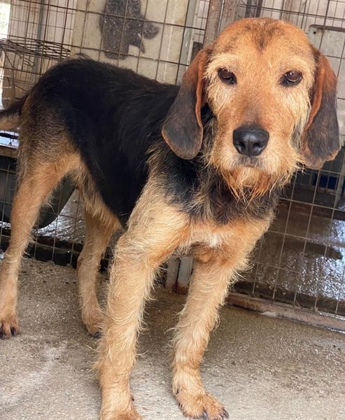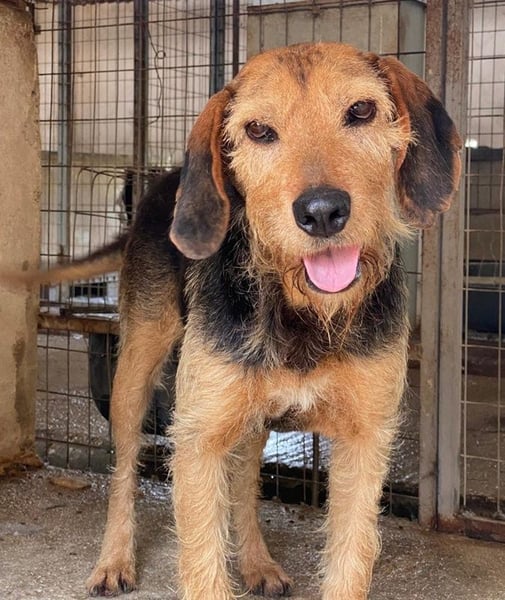 Yasko ist ein braun-schwarzer, mittelgroßer Jagdhundrüde mit drahtigem Fell. Er hat ein süßes Bärtchen und lange Schlappohren. Unsere ehrenamtlichen Helfer vor Ort beschreiben Yasko als einen sehr freundlichen, aufgeschlossenen und verträglichen Rüden. Er ist ein total lieber Hund, der stets den Kontakt zum Menschen sucht, ohne dabei zu stürmisch zu sein. Niemand weiß, ob er jemals ein Zuhause hatte und das Leben im Haus kennengelernt hat. Deshalb wünschen wir uns für Yasko ein Zuhause mit Garten, um ihm die Eingewöhnungsphase zu erleichtern. Zudem wünschen wir uns für ihn eine Familie, die Freude an der Erziehung eines Hundes hat und ihn auch jagdhundgerecht auslasten möchte – etwa durch Suchspiele.