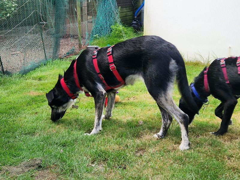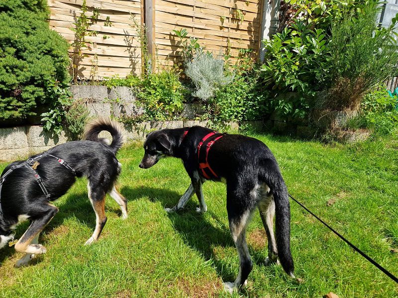 Bei Spaziergängen zeigt Inky sich manchmal noch etwas unsicher. Bei ihr unheimlichen Situationen versucht sie zurückzuweichen. Aber auch die werden immer seltener und meistens läuft sie entspannt neben einem her. Inky ist ein Rohdiamant mit zauberhaften Ansätzen. Pflegefrauchen hat sie jedenfalls komplett um die Pfote gewickelt ;-)