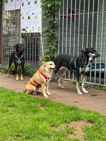 Sie ist sehr verträglich mit anderen Hunden. Neue Pflegegeschwister werden anstandslos in das Rudel integriert und von ihr akzeptiert. Mit ihnen durch den Garten zu toben findet sie großartig. Auch samstags auf dem Schutzhof fügt sie sich immer problemlos in die Gruppe ein.