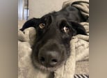 Emrys ist ein wunderschöner Rüde. Sein Fell ist glänzend schwarz, und er hat sehr süße Schlappohren. Außerdem ziert ein großer weißer Fleck seine Brust.