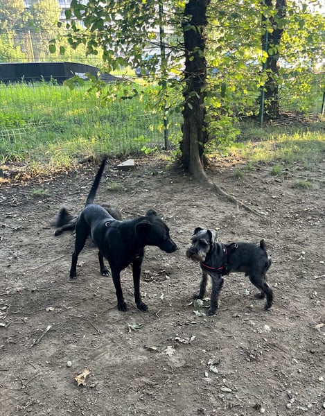 Hunden, die sie bereits kennt, begegnet sie sehr verspielt. Sie liebt es sehr mit diesen zu spielen und kuscheln, nur haben die vorhandenen Hunde nicht immer Lust dazu. Mit unbekannten Hunden ist sie erstmals vorsichtig, lässt sich aber relativ schnell überzeugen, wenn der andere Hund freundlich ist. Bei kleineren Hunden taut sie schnell auf und spielt ausgelassen, große Hunde machen ihr Angst am Anfang.