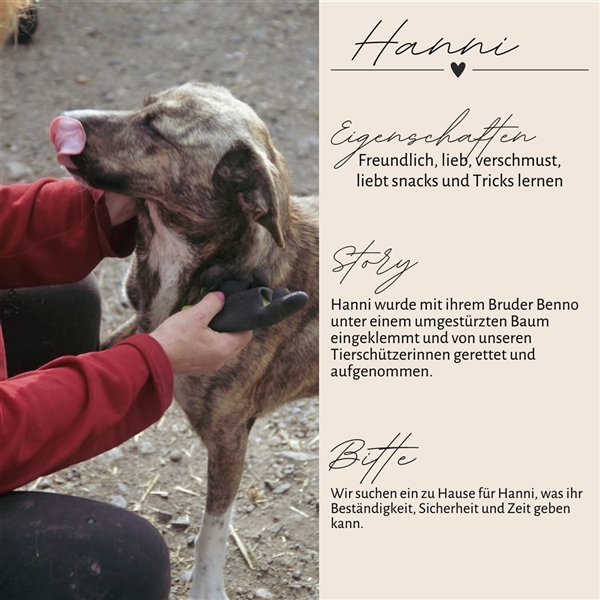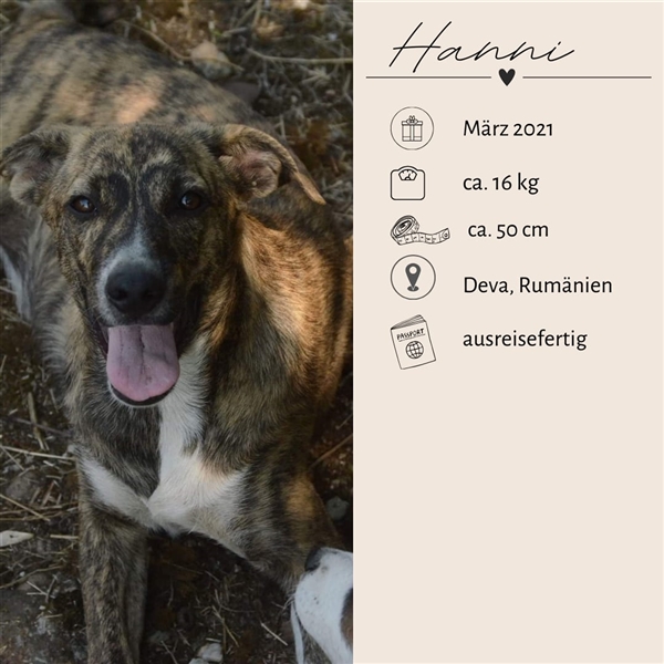 Die wunderschöne Hündin ist im März 2021 geboren und wiegt ca. 16 kg. HANNI ist mittelgroß, so ca. 50 cm. Nun ist sie bereits eine ganze Weile in unserem Tierheim in Rumänien und so ist es verständlich, wenn sie anfangs scheu und unsicher ist. Sie muss erst vertrauen fassen. HANNI ist dann aber freundlich, lieb und verschmust, aber vor allem geht ihr nichts übers Essen. Wer weiß, wie lange sie hungern musste, und da ist es durchaus verständlich, dass sie vor Freude winselt, wenn sie sieht, dass jemand etwas in der Hand hält, weil sie denkt, es wäre etwas zu essen für sie. Ihre zweite große Leidenschaft ist das Erlernen von Tricks, was zeigt, wie ungeheuer intelligent sie ist. In kürzester Zeit lernte sie Pfote geben und das Bringen von Spielzeug, was ihr auch große Freude bereitet. Nun wartet Hanni nur noch auf DIE Menschen, die ihr Talent weiterhin fördern und mit ihr durch dick und dünn gehen.