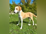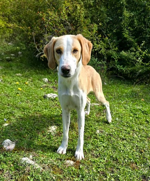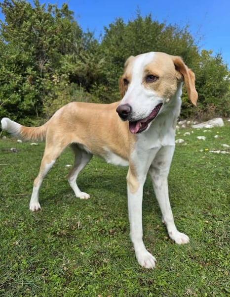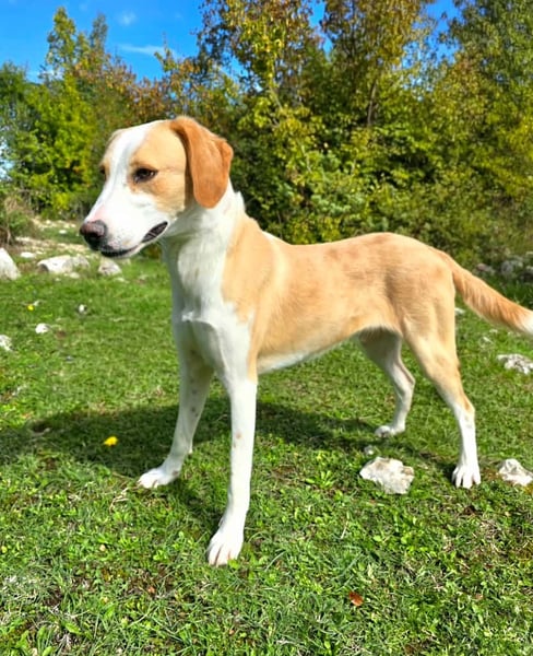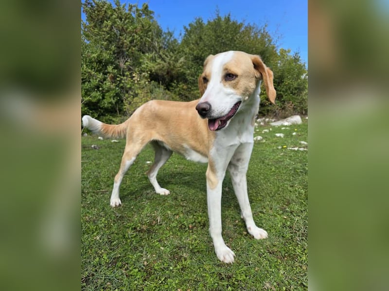 Kroki ist einer dieser Hunde, bei denen man automatisch lächeln muss. Mit seinem hübschen Gesicht, den langen Beinen und diesem leicht schiefen, charmanten Blick sieht er aus, als käme er direkt aus einem Hunde-Modelcasting. Nur dass er statt Glamour lieber in der Wiese tobt.