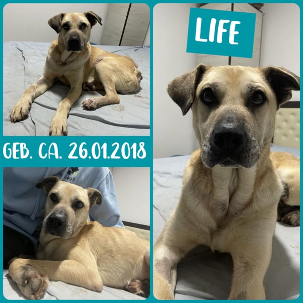 Innerlich sind einige „Wunden“ noch zu überstehen, auch wenn Life sein Leben so nimmt, wie es gerade ist: entspannt mit seinen Hundekumpels im Garten liegen, spielen und schmusen. Nur vereinzelte Artgenossen mag der große stattliche Vierbeiner nicht.