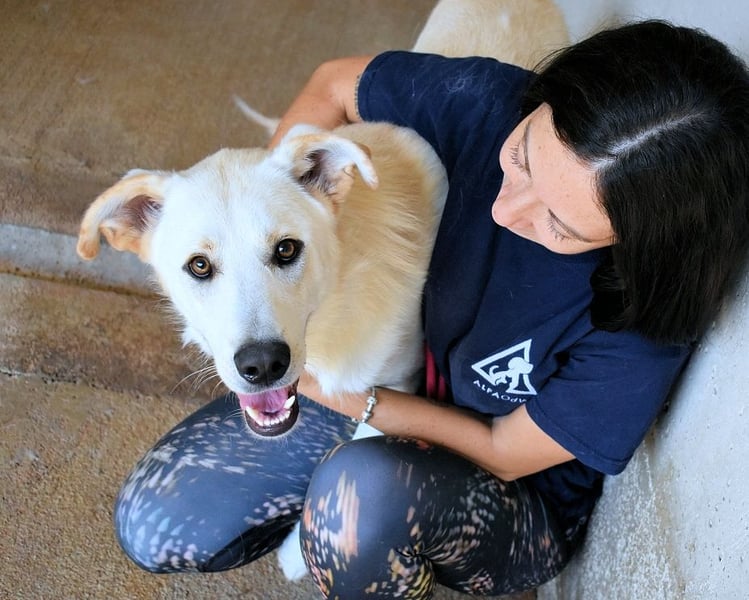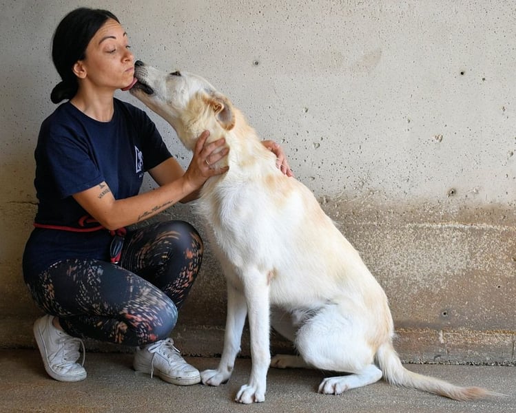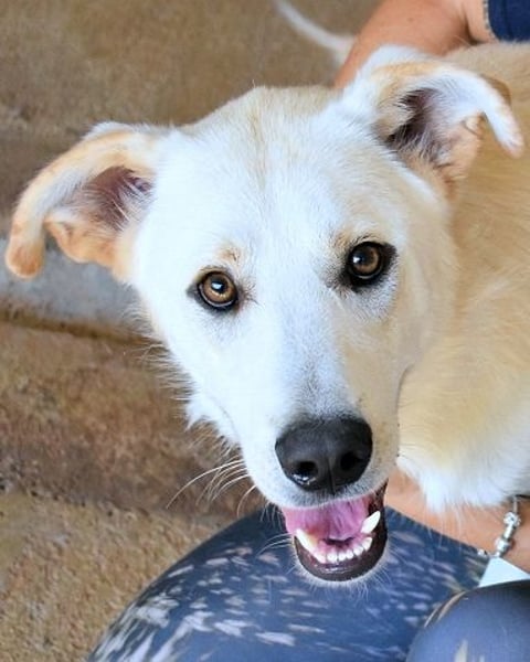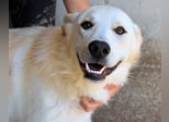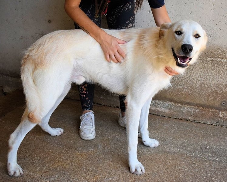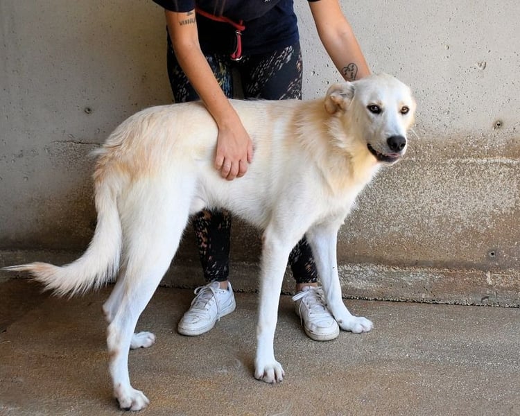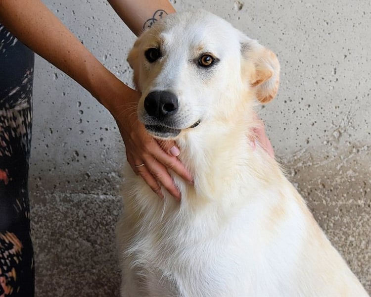 Dieser weiße Hund gehört nicht ins Grau des Zwingers, sondern in Ihr Leben – sprechen Sie mit unserer Vermittlerin und machen Sie jeden Tag zum Konfettifest.