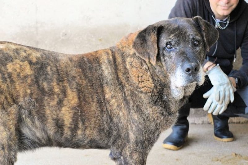 Annius ist einer dieser Hunde, bei deren Anblick einem fast das Herz stehen bleibt. Sein leicht trüber, fragender Blick, sein viel zu dickes, nie gekämmtes, vermutlich verfilztes Fell, sein vom jahrelangen Nichtstun und schlechtem Futter zu schwerer Körper. Sein heiseres Bellen, mit dem er sich misstrauisch die bislang meistens unangenehmen Zweibeiner vom Leib halten will - oder ruft er einfach voller Verzweiflung um Hilfe?