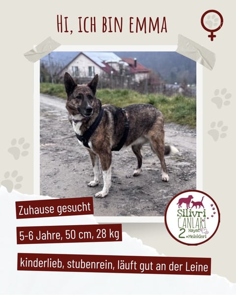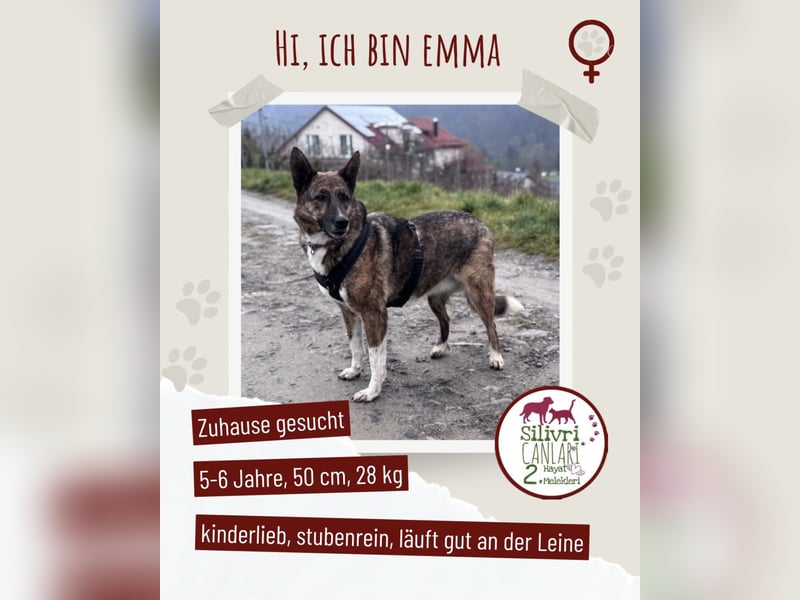 Emma befindet sich seit Anfang Dezember auf einer Pflegestelle in 74394 Hessigheim und zeigt sich dort als äußerst freundliche und menschenbezogene Hündin. Sie sucht aktiv den Kontakt zu Menschen und genießt Streicheleinheiten. Mit Kindern kommt sie sehr gut zurecht.