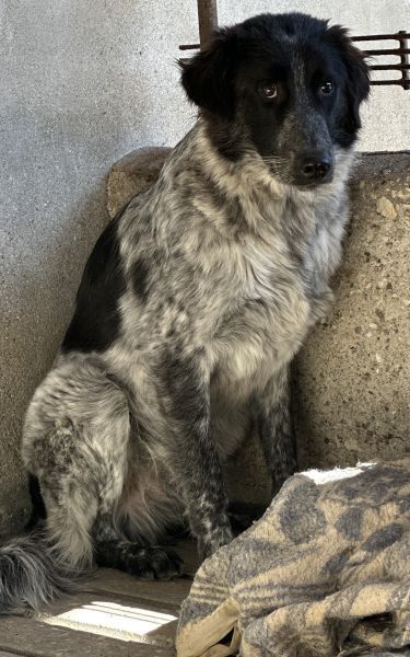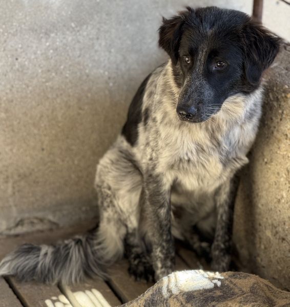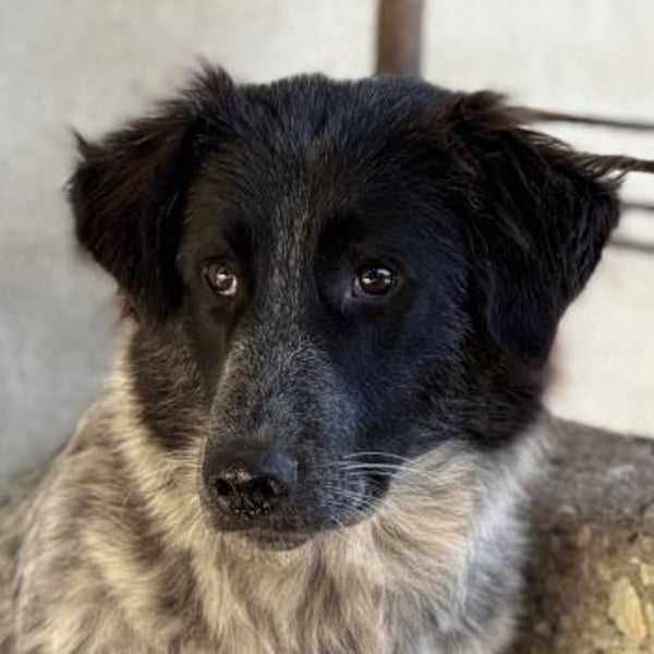 Ashwin ist ein wunderschöner Rüde. Sein Fell hat eine besondere Farbgebung: Tiefschwarz an Kopf und Ohren bildet es einen sanften Kontrast zu den weiß-grauen Partien an Brust und Körper. Seine dunklen, aufmerksamen Augen unterstreichen seinen warmherzigen und zugleich vorsichtigen Ausdruck.