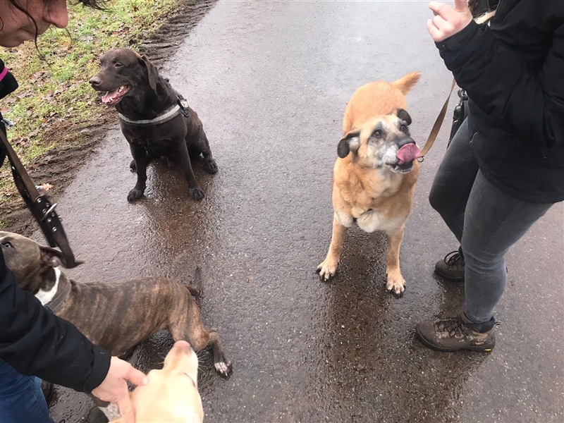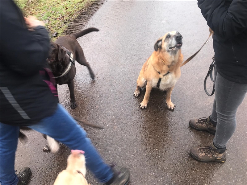 Zuhause angekommen, legt sie sich am liebsten entspannt auf ihren Platz. Generell hört man von Neula nicht besonders viel, wenn man sich in der Wohnung befindet. Lediglich, wenn sie einem leise hinterher schleicht, weil sie am liebsten immer da sein möchte, wo ihre Bezugsperson sich aufhält, bemerkt man sie kurz. Im nächsten Raum wird sich dann aber gleich wieder abgelegt und es ist genau so still wie vorher. Ich könnte mir vorstellen, dass Neula sogar eine gute Figur als „Bürohund“ machen könnte, wenn man sie mit auf die Arbeit nehmen darf. Dazu lässt sich nämlich auch gleich erwähnen, dass Neula fremden Menschen gegenüber unglaublich aufgeschlossen ist. Egal ob mein Sohn (7 Jahre) Besuch von einem seiner Freunde bekommt, die Oma zu Besuch kommt, der Heizungsistallateur da ist…Neula begrüßt sie alle freundlich. Auch mit anderen Hunden ist sie sehr gut verträglich. Abgesehen von meiner eigenen 1 Jahr alten Hündin, hatten wir schon Treffen mit Hunden jeder Altersklasse und jeden Geschlechts. Egal ob die kleine Mischlingshündin Shae mit ihren 6 Monaten um Neula wuselt, die beiden Australian Shepherd Welpen Merlen und Owen sie in Beschlag nehmen, oder wir mit den Labrador Geschwistern Paul und Mimi spazieren gehen – Neula lässt sich von nichts aus der Ruhe bringen und freut sich über ihre Artgenossen. Auch in der Wohnung ist sie bei Hundebesuch immer entspannt und gelassen.