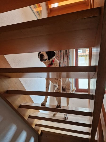Sie orientiert sich stark an ihren Bezugspersonen und zeigt, dass sie Teil ihres Rudels sein möchte. Am wohlsten fühlt sie sich, wenn sie bei ihren Menschen sein darf – insbesondere nachts im Schlafzimmer oder in deren Nähe. Das gibt ihr Sicherheit und Ruhe. Mara kannte keine Treppen, bewegt sich aber auf ebenerdigen Flächen sicher und meistert diese mittlerweile.